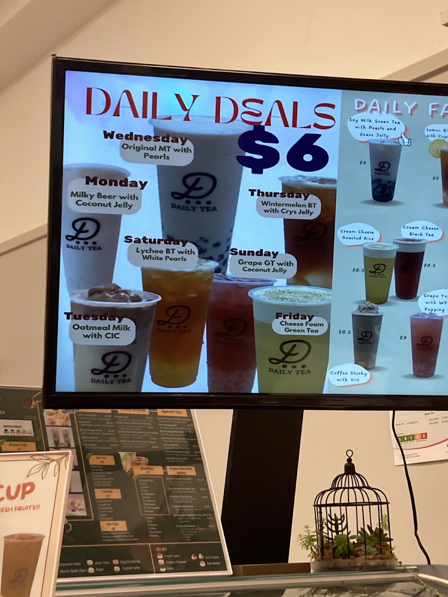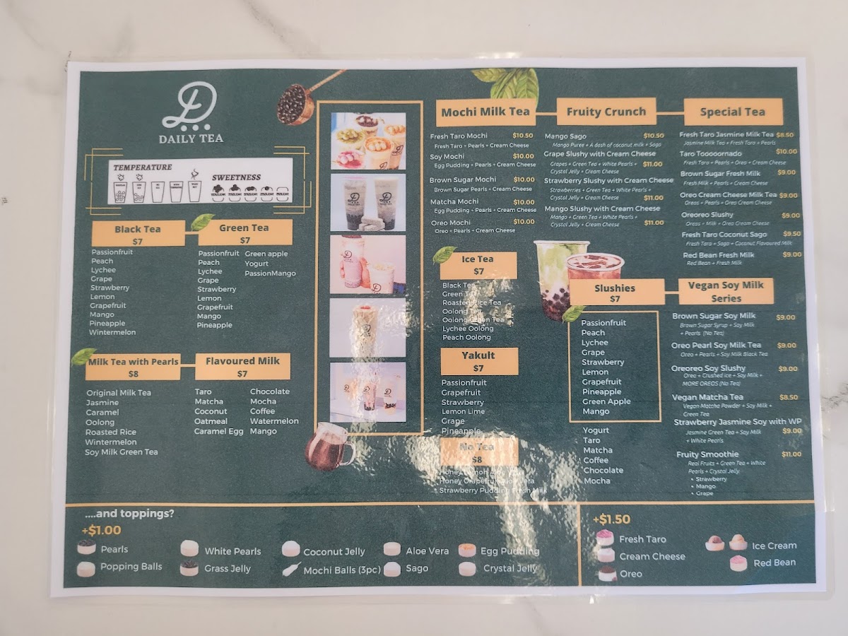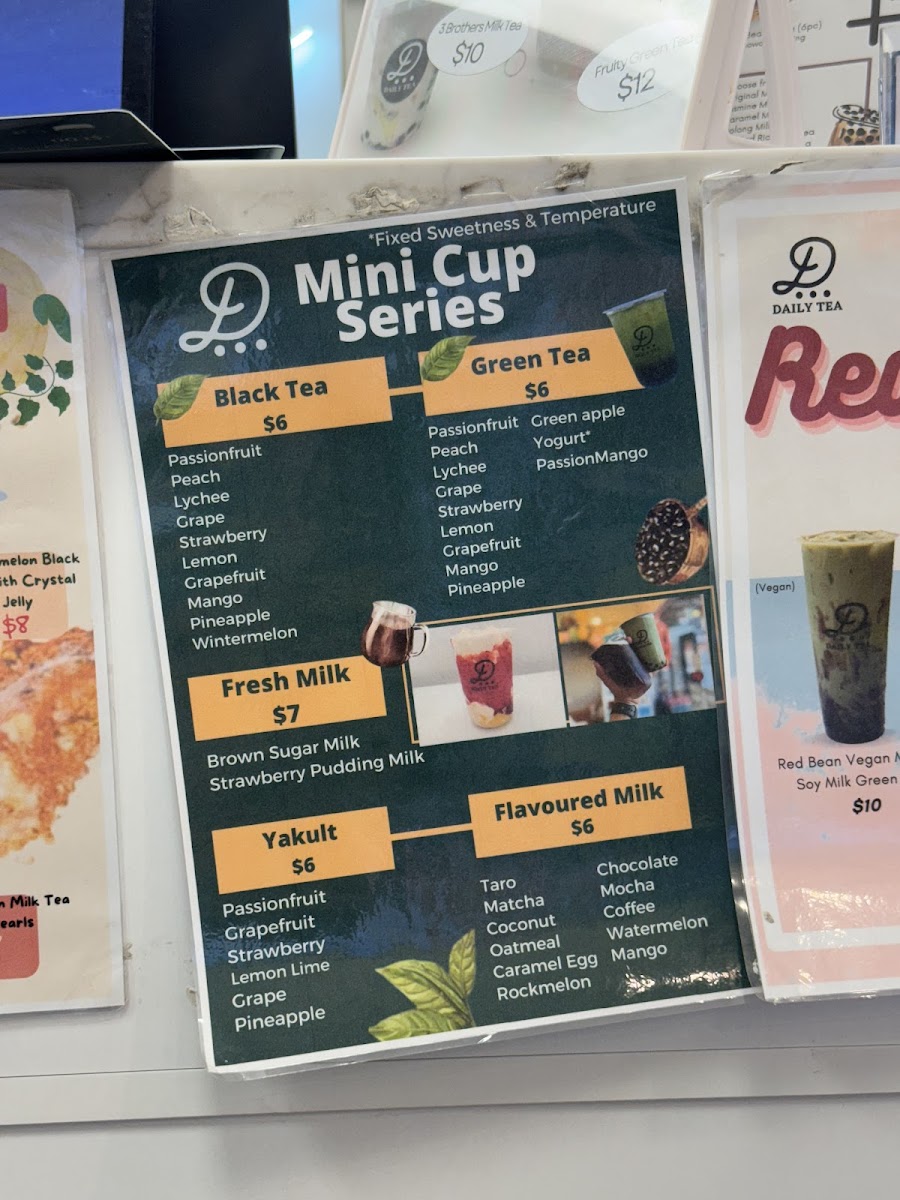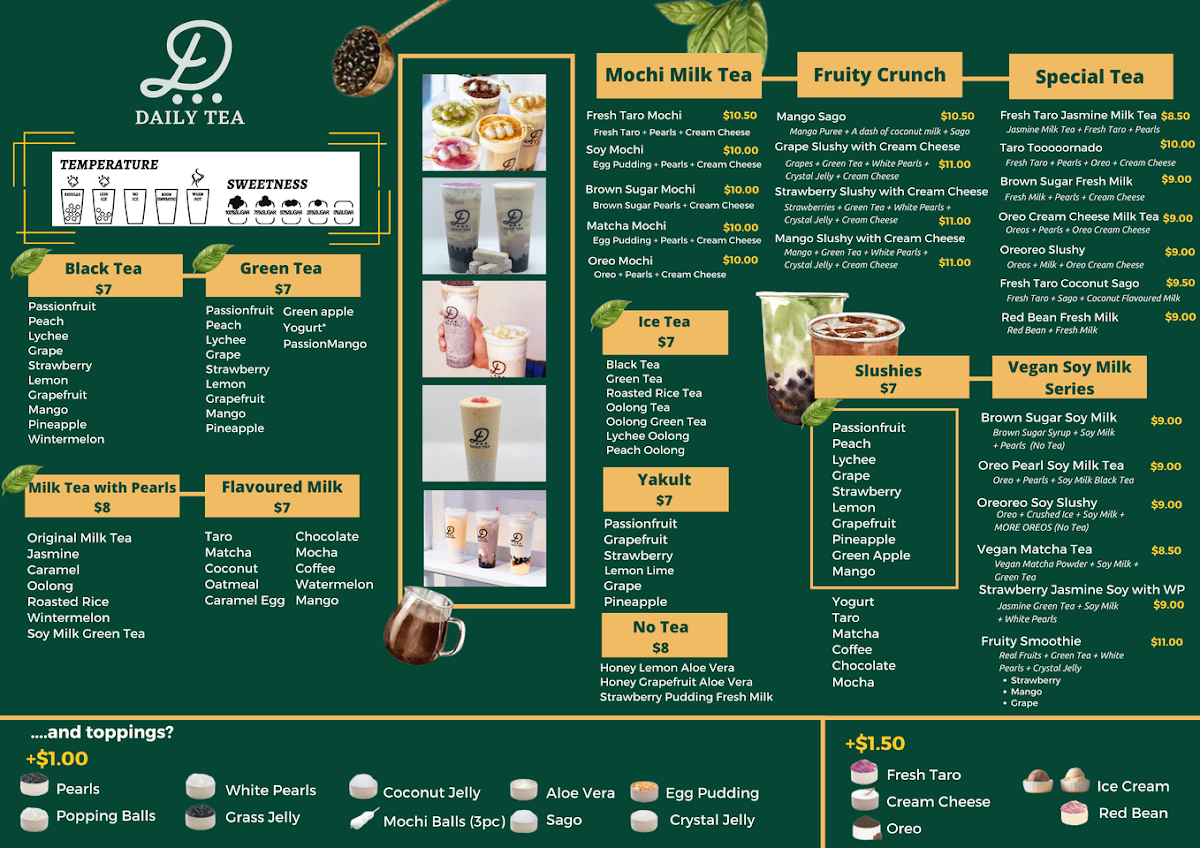 Daily Tea Birkenhead offers a diverse and exciting menu, perfect for any craving. Their drinks range from refreshing Yakult Drinks like Passion Fruit Yoghurt and Pineapple Yakult to vibrant Black Teas such as Lemon Black Tea and Wintermelon Black Tea. For those with a sweet tooth, there are indulgent Flavoured Milk options like Taro Milk and Matcha Milk, as well as a tempting Mochi Milk Tea selection including Oreo Mochi Milk Tea and Brown Sugar Mochi Milk Tea. Vegan guests will enjoy creative choices from the Vegan Special Series, like the Oreoreo Soy Slushy and Matcha Soy Milk Green Tea with Pearls. For a lighter touch, try the refreshing No Tea options, such as Honey Lemon with Aloe Vera or Strawberry Fresh Milk with Egg Pudding. The Slushies menu features fruity delights like Mango Slush and Chocolate Slush, while the Espresso Series offers bold lattes like Green Tea Espresso Latte and Strawberry Espresso Latte. Those looking for something extra special can indulge in the Special Series with options like Oreo Matcha and Taro Tooooornado. Don't forget the snacks, with mouthwatering items like Mango Soy Cakey and Pumpkin Cakes with Red Bean Filling (available before 7:30 PM). Whether you're in the mood for a chilled drink or a warm beverage, Daily Tea Birkenhead has something to satisfy every taste.