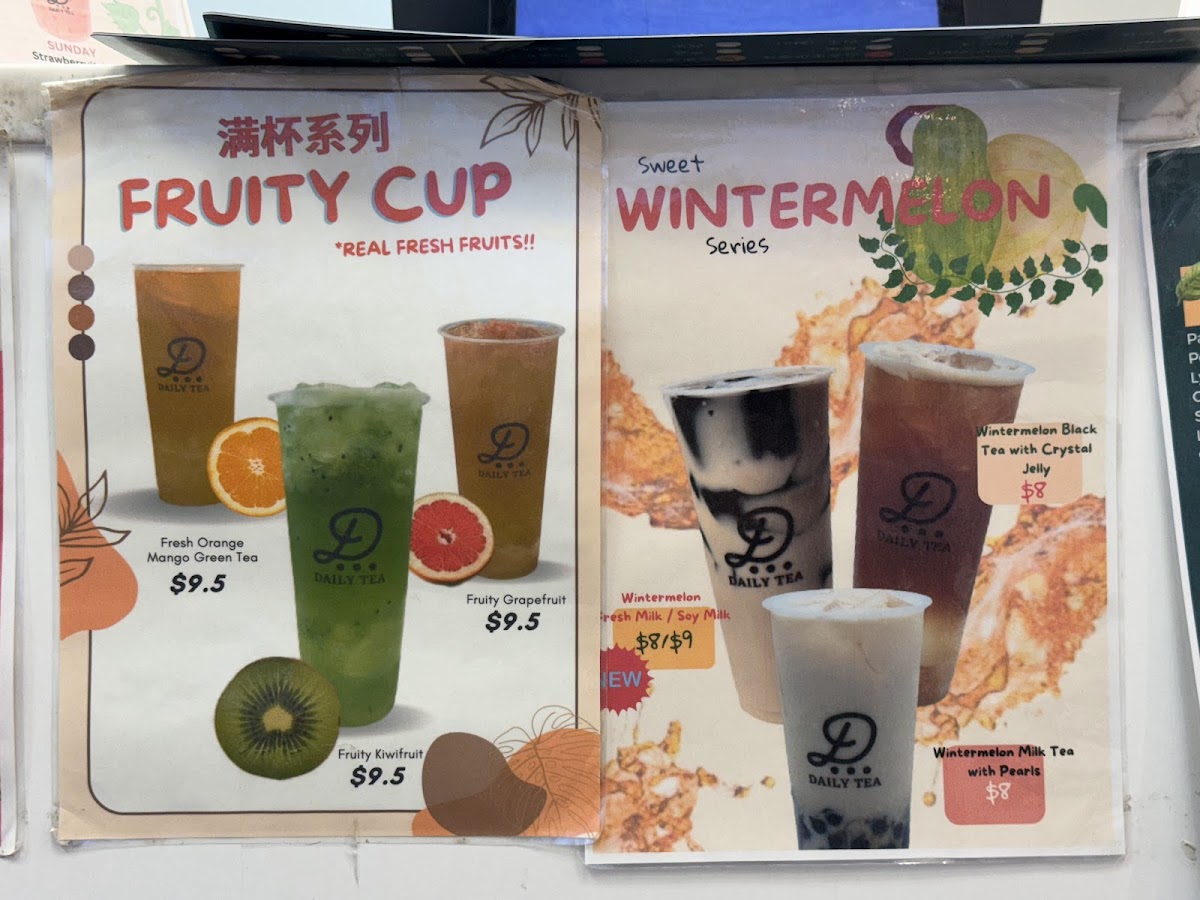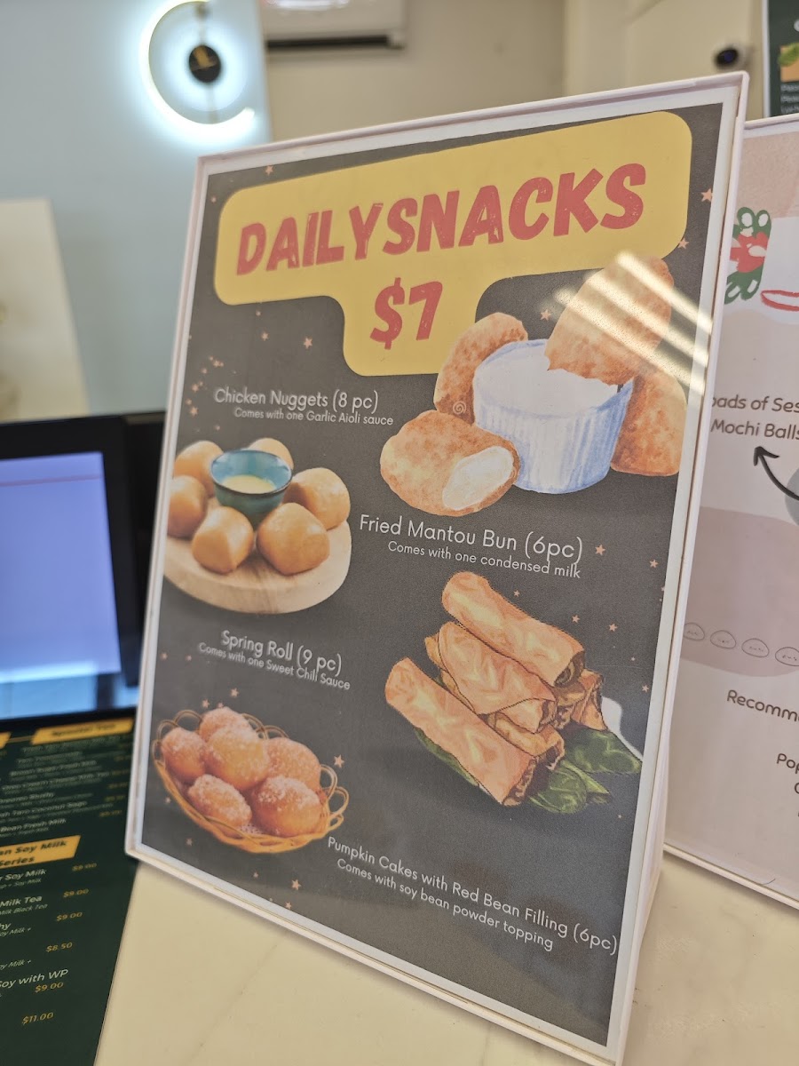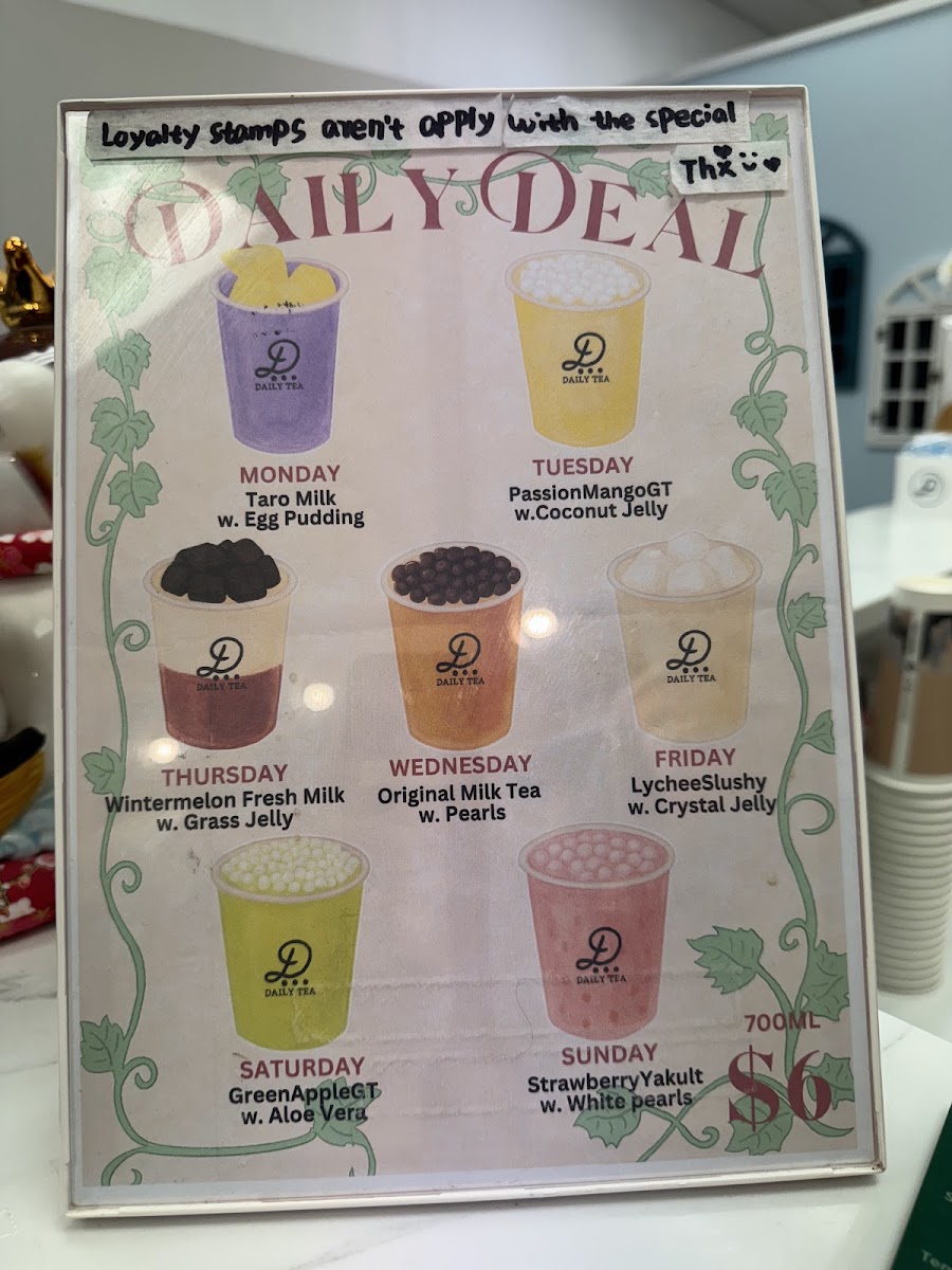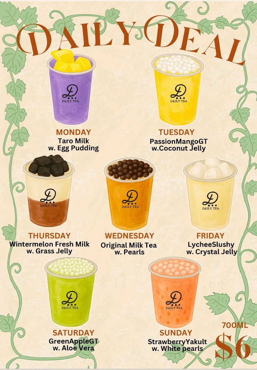 Daily Tea Birkenhead offers a diverse and exciting menu, perfect for any craving. Their drinks range from refreshing Yakult Drinks like Passion Fruit Yoghurt and Pineapple Yakult to vibrant Black Teas such as Lemon Black Tea and Wintermelon Black Tea. For those with a sweet tooth, there are indulgent Flavoured Milk options like Taro Milk and Matcha Milk, as well as a tempting Mochi Milk Tea selection including Oreo Mochi Milk Tea and Brown Sugar Mochi Milk Tea. Vegan guests will enjoy creative choices from the Vegan Special Series, like the Oreoreo Soy Slushy and Matcha Soy Milk Green Tea with Pearls. For a lighter touch, try the refreshing No Tea options, such as Honey Lemon with Aloe Vera or Strawberry Fresh Milk with Egg Pudding. The Slushies menu features fruity delights like Mango Slush and Chocolate Slush, while the Espresso Series offers bold lattes like Green Tea Espresso Latte and Strawberry Espresso Latte. Those looking for something extra special can indulge in the Special Series with options like Oreo Matcha and Taro Tooooornado. Don't forget the snacks, with mouthwatering items like Mango Soy Cakey and Pumpkin Cakes with Red Bean Filling (available before 7:30 PM). Whether you're in the mood for a chilled drink or a warm beverage, Daily Tea Birkenhead has something to satisfy every taste.
